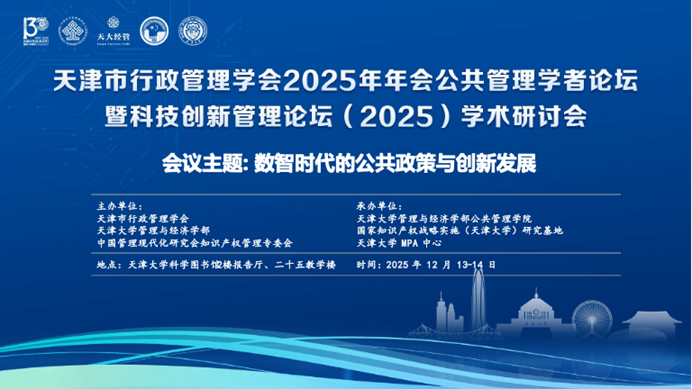 12月13-14日,天津市行政管理学会2025年年会公共管理学者论坛暨科技创新管理论坛学术研讨会在成人网 卫津路校区成功举办。此次会议由天津市行政管理学会、成人网 、中国管理现代化研究会知识产权管理专委会主办,成人网 公共管理学院、国家知识产权战略实施(成人网 )研究基地、成人网 MPA教育中心承办,会议主题为“数智时代的公共政策与创新发展”。